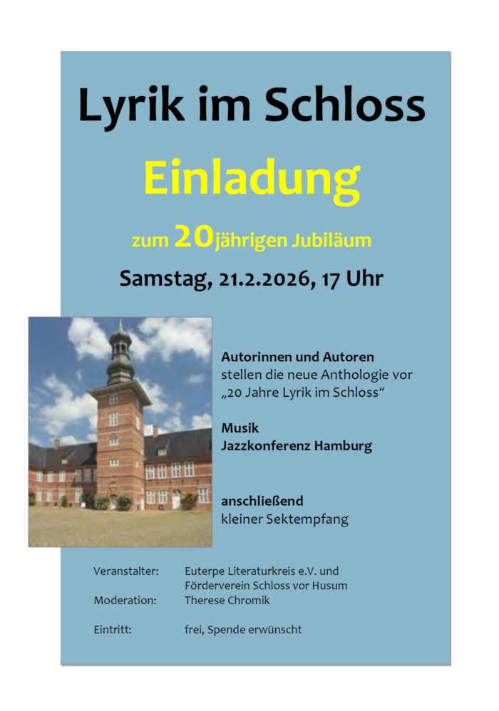 Von München nach Husum kommt der Autor Uwe-Michael Gutzschhahn auf die Bitte von Therese Chromik, um in Husum in der Reihe „Lyrik im Schloss“  zu lesen. Er stellt seinen neuen Lyrikband vor, der den Titel trägt: